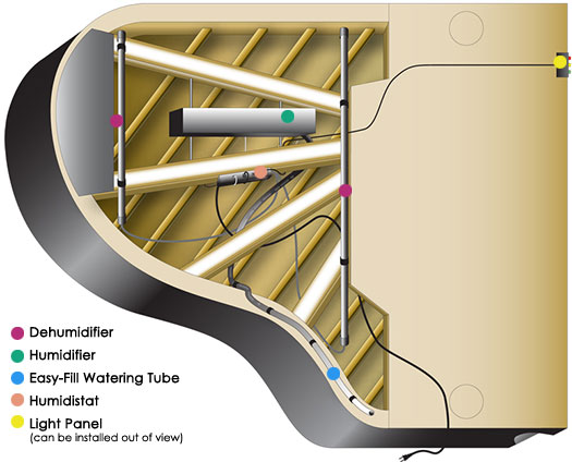 The Piano Life Saver system minimizes this fluctuation and aims to provide a more stable humidity inside the piano year round. Benefits include improved tuning stability, smooth mechanical function, and an overall increased longevity of your instrument. Visit the Dampp-Chaser website for more information on the Piano Life Saver System